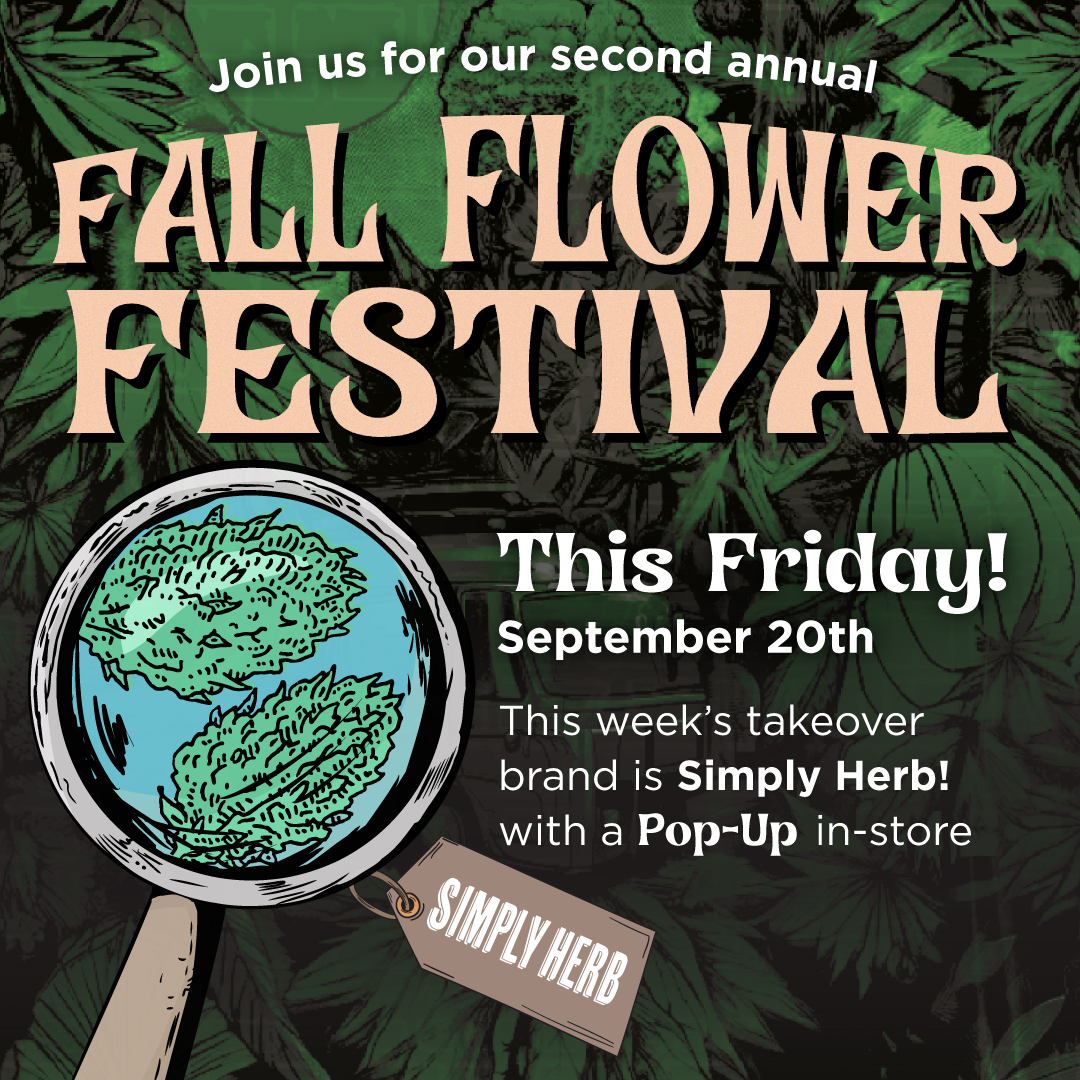 Welcome to our Fall Flower Festival, a fresh take on deli-style – which allows our customers to see and smell select strains, pick their buds, and learn about the brand growing the flower. The festival runs every Friday during September from 9am-8pm (while supplies last) and will feature a dedicated brand each week! Next up is Simply Herb on September 20th. Come check out their featured strains and also meet their team for a pop-up from 3-6pm.