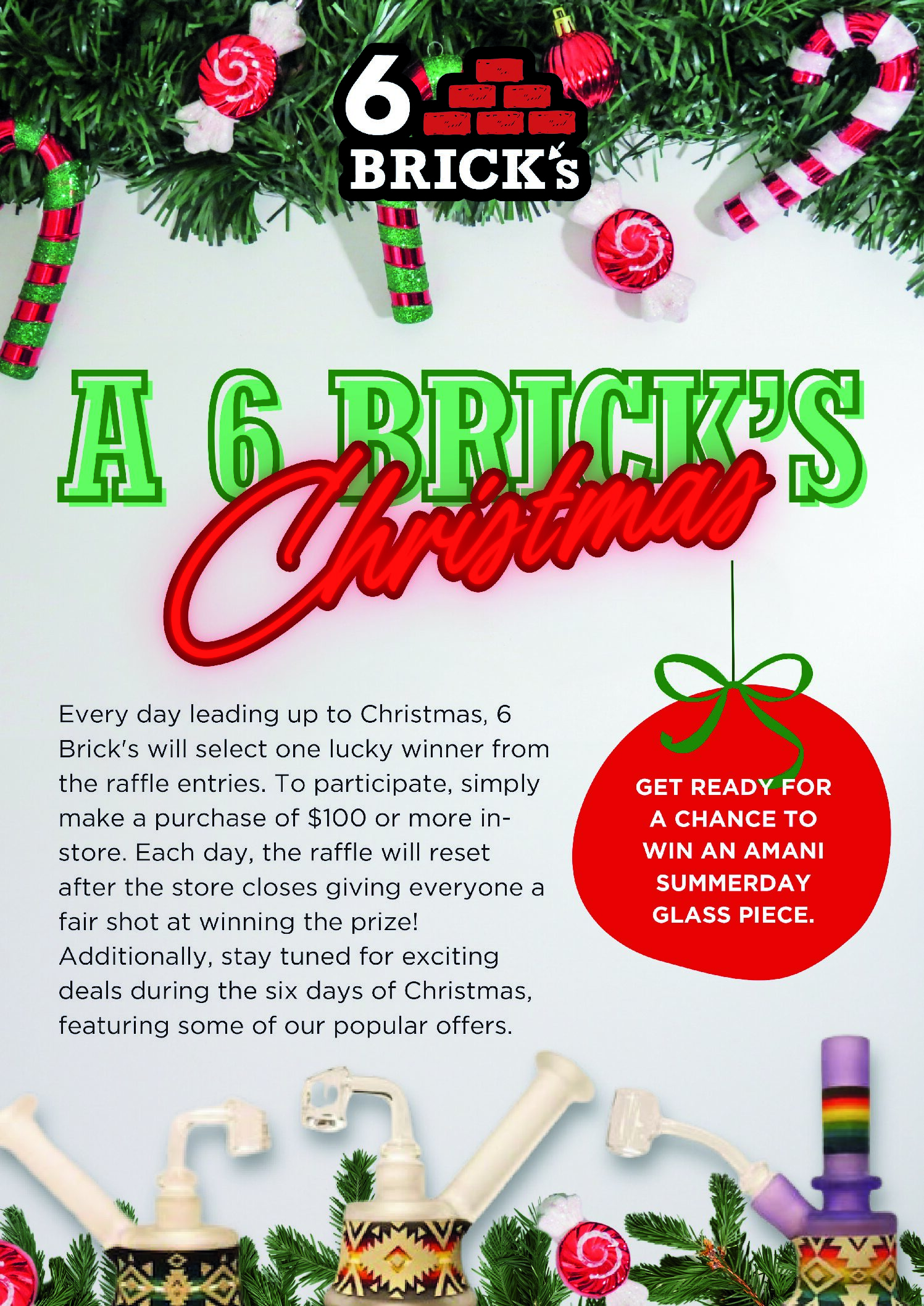 Every day leading up to Christmas (Monday 12/18 – Saturday 12/23) 6 Brick’s will select one lucky winner from the raffle entries. To participate, simply make a purchase of $100 or more in-store. Each day, the raffle will reset after the store closes, giving everyone a fair shot at winning the prize. The prizes include glass pieces created by Amani Summerday. Sunday 12/24 is the last day to collect your prize if chosen as one of the lucky winners.