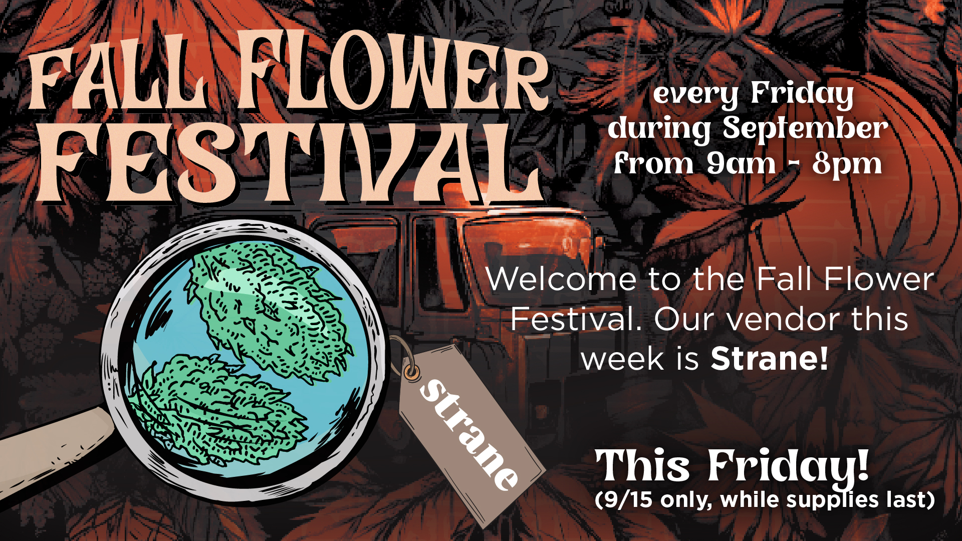 Welcome to Fall Flower Festival – every Friday during September from 9am – 8pm or while supplies. Our vendor this week is STRANE with the Bertha Bus. Come check out their featured strains and also meet their team.