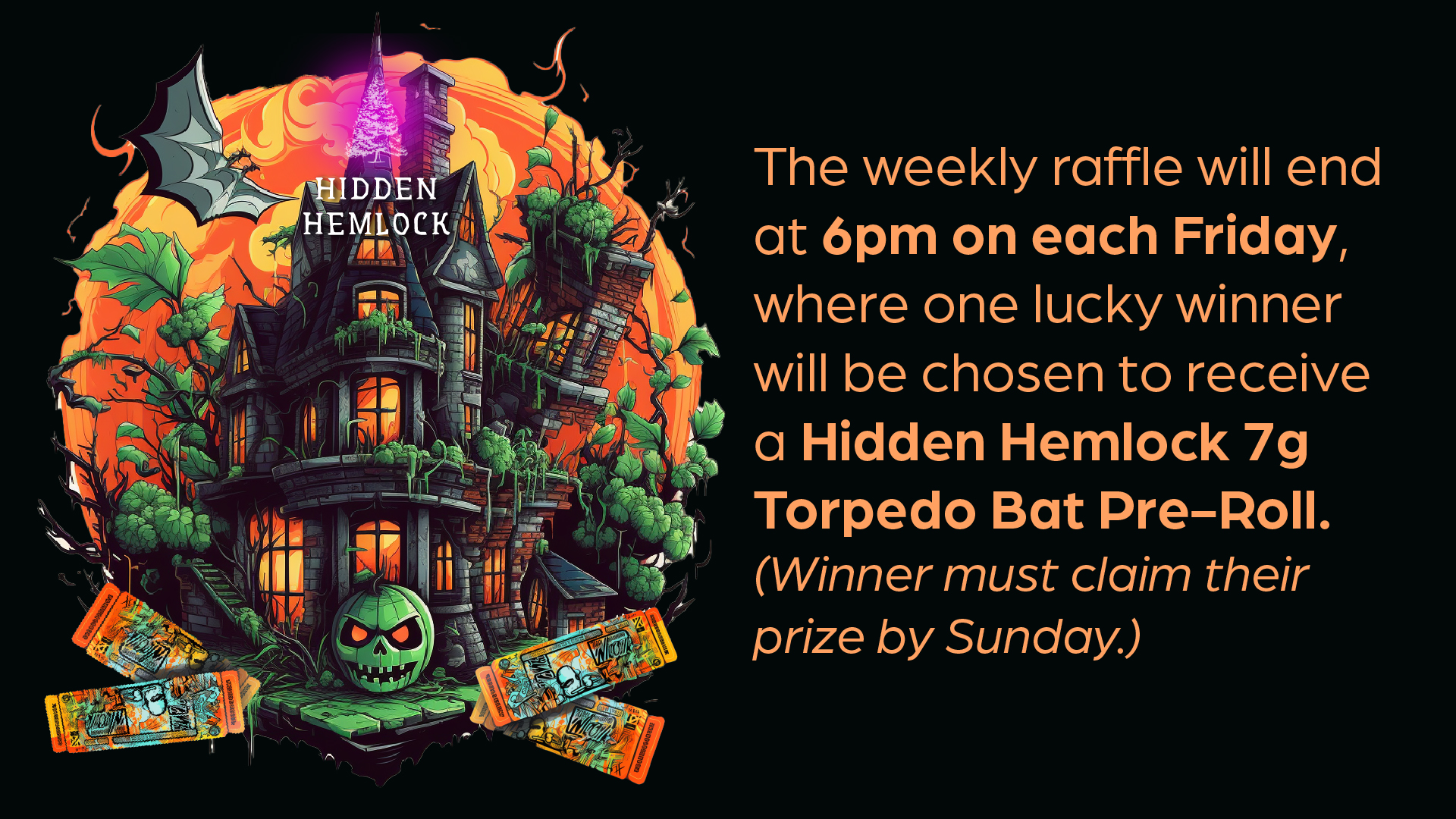 Welcome to our Hidden Hemlock Bat Raffle, running every Friday in October at our Springfield weed dispensary. The weekly raffle will end at 6pm each Friday, where one lucky winner will be chosen to receive a Hidden Hemlock 7g Torpedo Bat pre-roll. To enter, purchase any Hidden Hemlock product available on the 6 Brick’s menu. The winner has till Sunday to come in-store and pick up their prize!