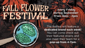 The Fall Flower Festival will feature a dedicated brand each week! You can come check out featured strains and also meet their team for a pop-up. This will be hosted EVERY FRIDAY in September from 9am - 8pm or while supplies last!